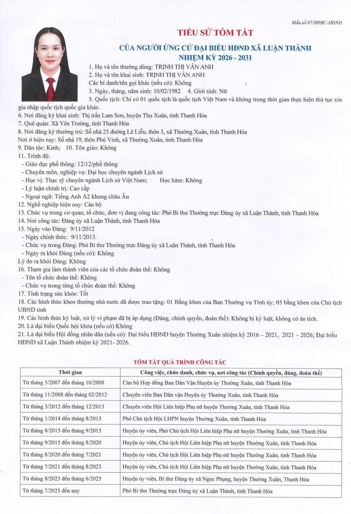 TIỂU SỬ TÓM TẮT CỦA NGƯỜI ỨNG CỬ ĐẠI BIỂU HĐND XÃ LUẬN THÀNH NHIỆM KỲ 2026-2031