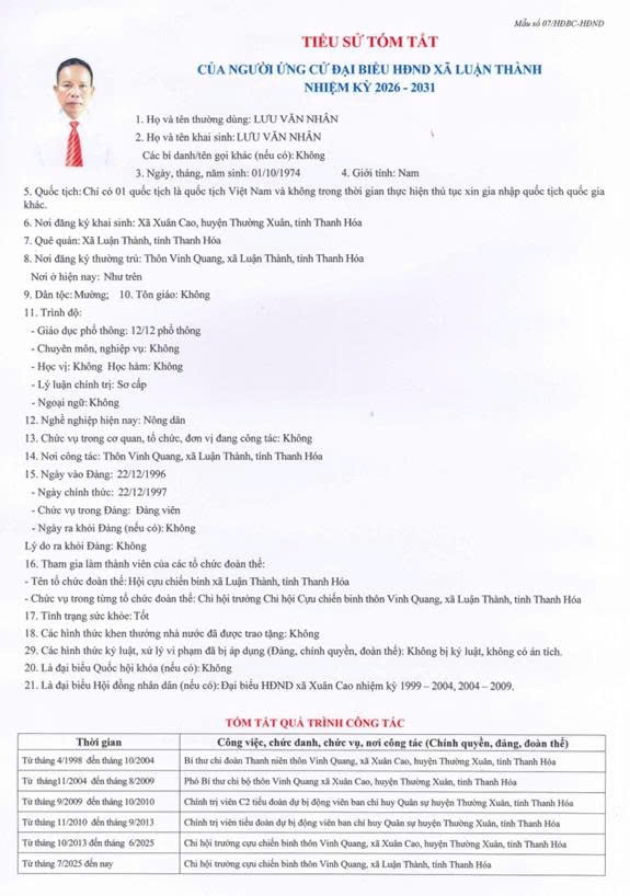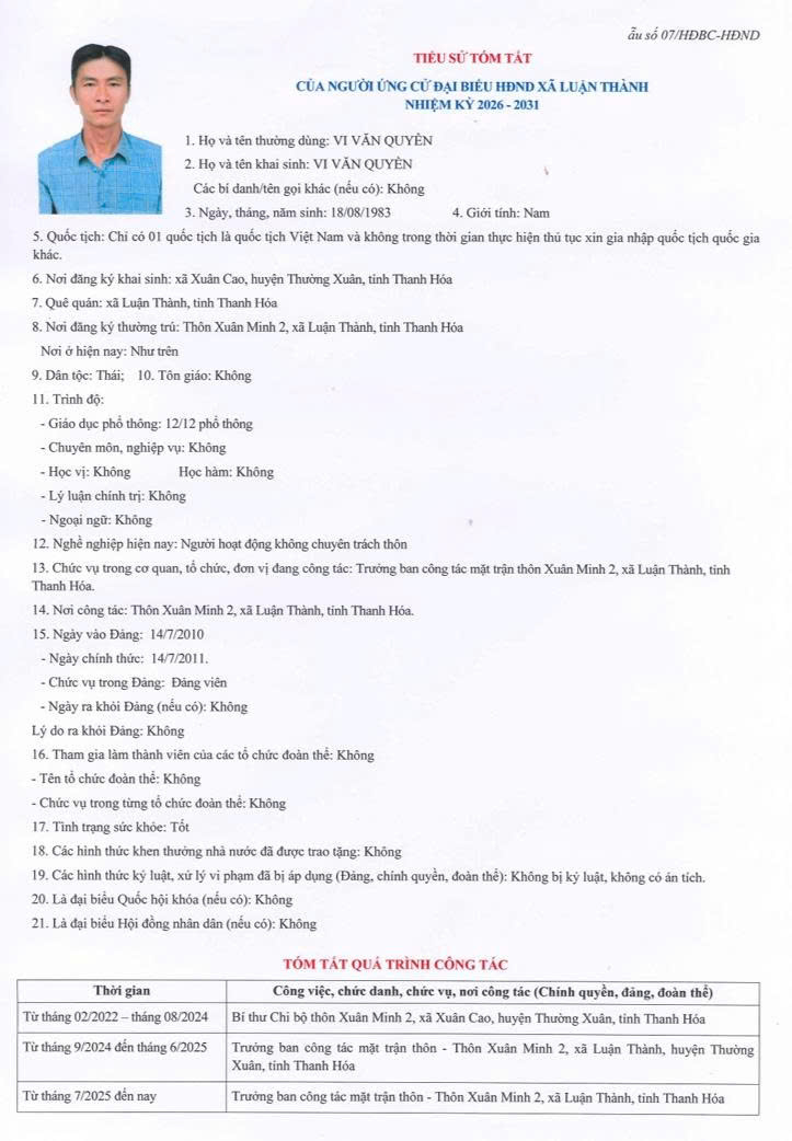 TIỂU SỬ TÓM TẮT CỦA NGƯỜI ỨNG CỬ ĐẠI BIỂU HĐND XÃ LUẬN THÀNH NHIỆM KỲ 2026-2031