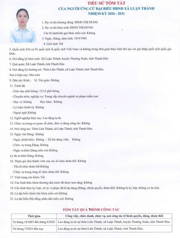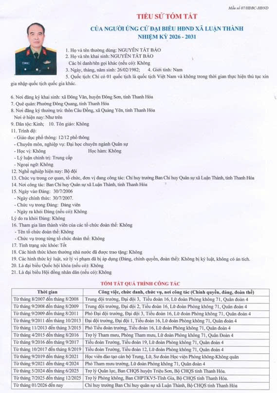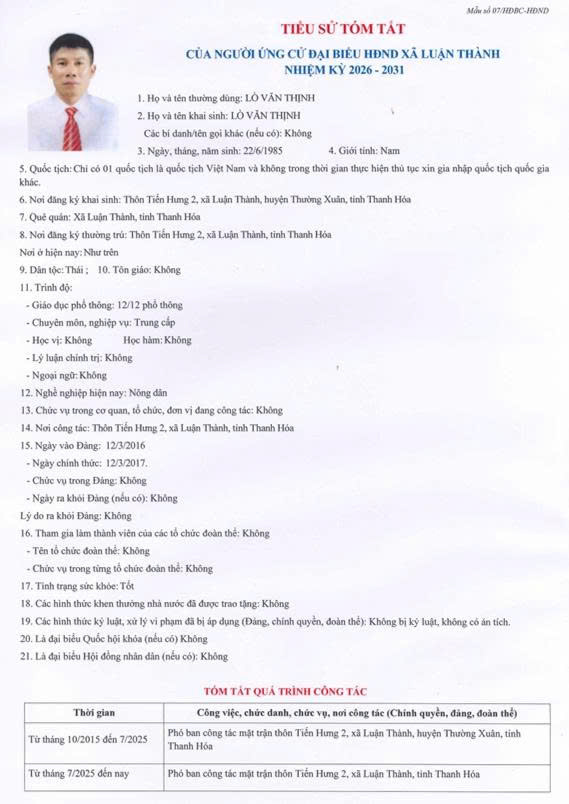 TIỂU SỬ TÓM TẮT CỦA NGƯỜI ỨNG CỬ ĐẠI BIỂU HĐND XÃ LUẬN THÀNH NHIỆM KỲ 2026-2031