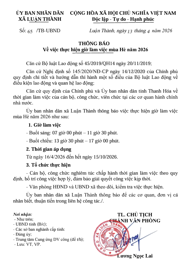 ỦY BAN NHÂN DÂN XÃ LUẬN THÀNH THÔNG BÁO Về việc thực hiện giờ làm việc mùa Hè năm 2026
